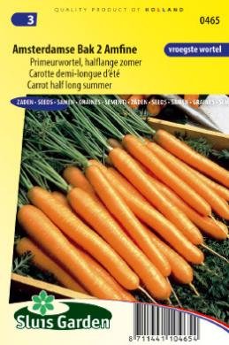 Sélection maraîchère. La variété Amsterdamse bak est la plus précoce des carottes, dite ‘carotte primeur’. Savoureuse et fine carotte orange vif à la saveur délicieusement sucrée. Longueur d’environ 15 cm. Semer fin en lignes et ne pas éclaircir après la levée. Veiller à ce que le sol soit bien aéré afin que la carotte puisse y pousser sans difficultés. Apport d’engrais normal. Absolument pas d’utilisation de fumier. Recouvrir les plants d’un filet de protection afin que la mouche de la carotte n’y ait pas accès. Semer entre les lignes des oignons et des poireaux permet de lutter naturellement.